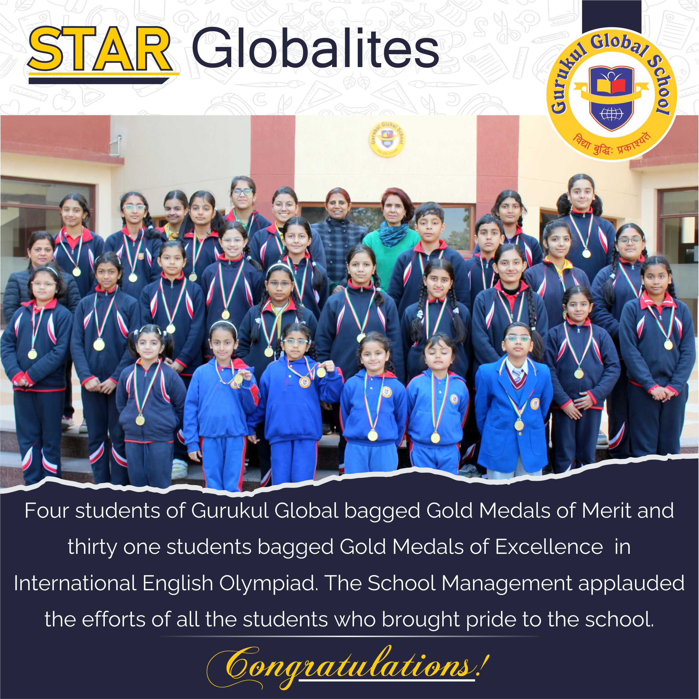 Four Gurukul Global Students bagged Gold Medals of Merit and thirty one students bagged Gold Medals of Excellence in International English Olympiad.